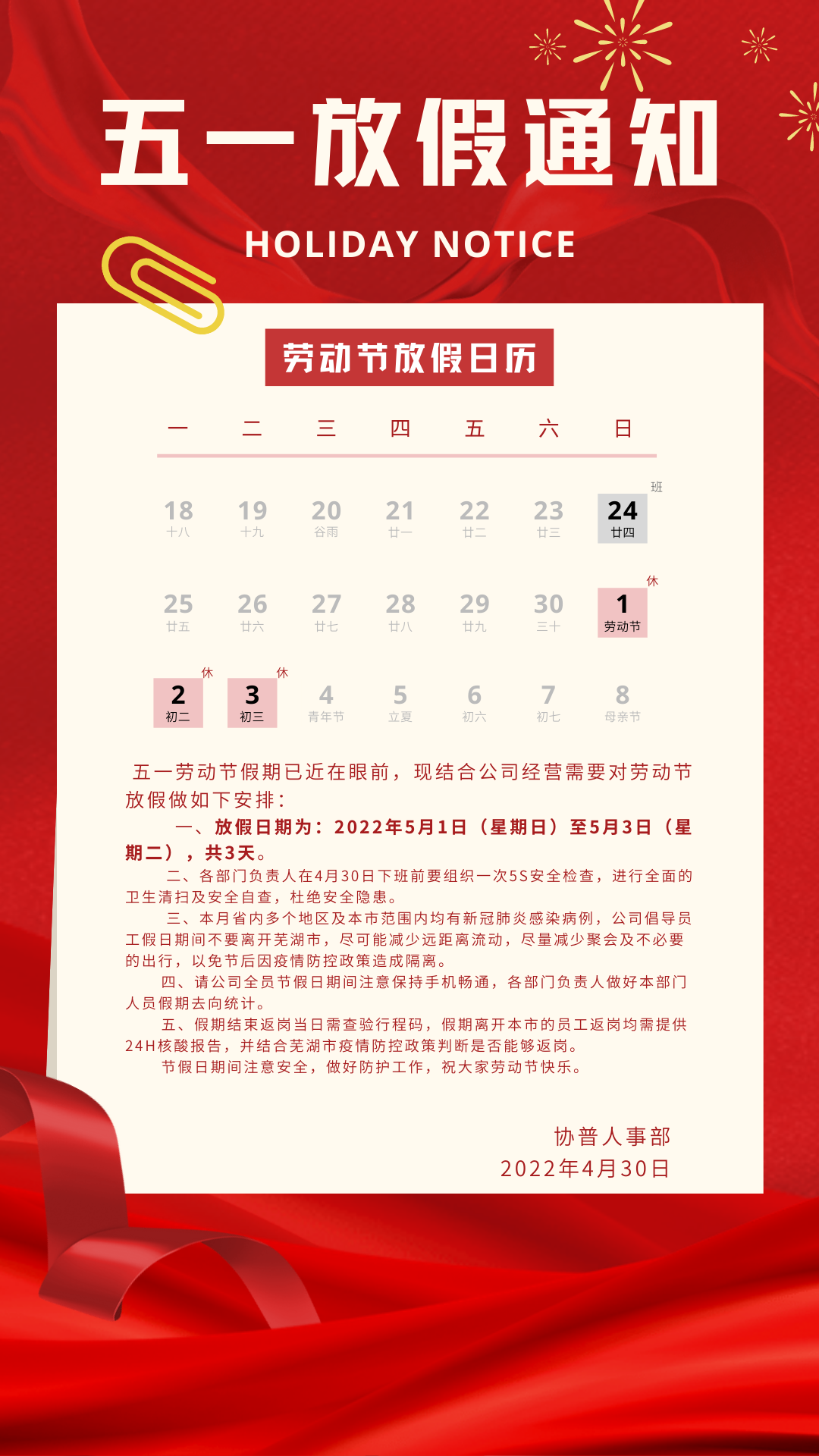 以下是協(xié)普“五一”勞動節(jié)放假時間安排: