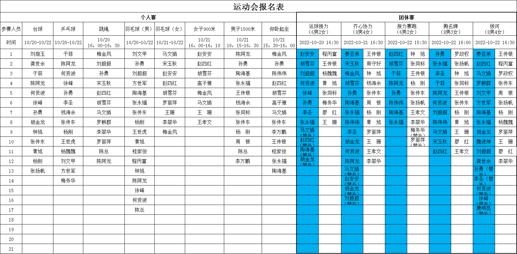 金秋送爽、丹桂飄香,在這秋高氣爽的美好時(shí)節(jié),我們滿懷喜悅的心情迎來(lái)了公司2022年度秋季職工運(yùn)動(dòng)會(huì)。本屆運(yùn)動(dòng)會(huì)分個(gè)人賽、團(tuán)體賽,自10月20日至22日共持續(xù)3個(gè)下午,比賽項(xiàng)目包括乒乓球、羽毛器(男子、女子單項(xiàng))、臺(tái)球、跳繩、仰臥起坐、女子900米,男子1500米長(zhǎng)跑8項(xiàng)個(gè)人賽,還有齊心協(xié)力、運(yùn)球接力、女子接力賽、男子接力賽、撕名牌、拔河共6項(xiàng)團(tuán)體賽。在歷屆運(yùn)動(dòng)會(huì)的賽程、賽項(xiàng)上都增加了新的活動(dòng)亮點(diǎn),從參賽名單上不難看出,全體協(xié)普家人的熱情和參與度都異常高漲。